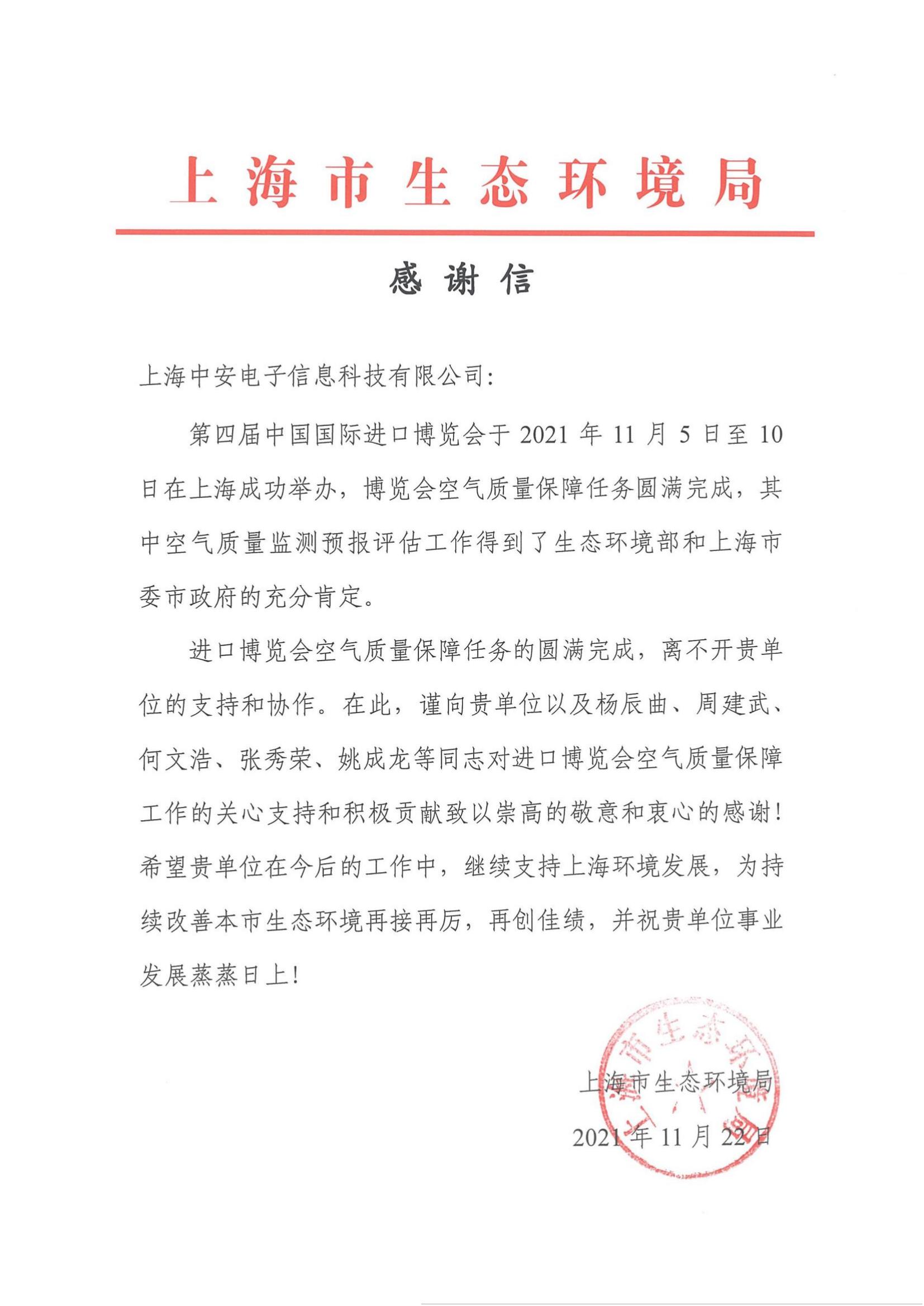 上海環監中心就中安科技在21年國際進博會空氣質量監測預報工作中杰出貢獻送來感謝信!(2021/12/31)